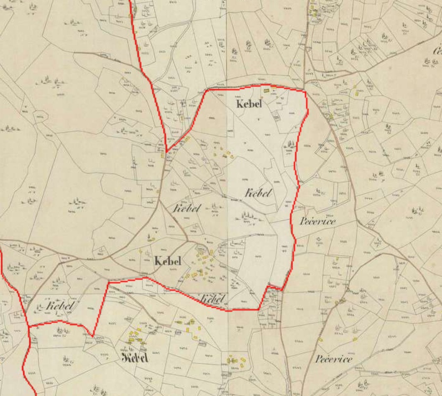 Područje točke Kebel i izvora Vojsek je na zanimljiv način razgraničeno od područja Bedekovčine i priključeno Svetom Križu Začretje i sada kao i slika dolje, na arcanum kartama iz 1860.g.: