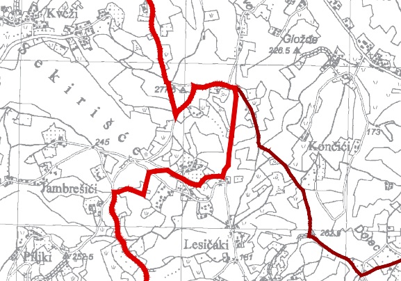 Ovdje uvedeni položaj toponima Gradišće se razlikuje za oko 150 m od istoimenog položaja u pravocrtnoj strukturi, a bolje se poklapa s ranije utvrđenim i obilježenim arheološkim lokalitetom Gradišće, što je jasno vidljivo dolje na karti HOK DGU.