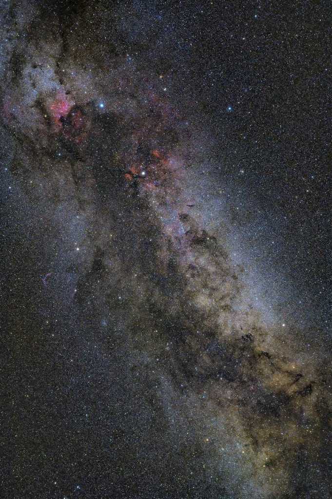 Zviježđe Labuda jedno je od prepoznatljivijih na ljetnom nebu. Kroz zviježđe prolazi sjajni Mliječni put, isprekidan tamnim područjima međuzvjezdane prašine. Na ovoj širokokutnoj fotografiji (objektiv 50 mm) se lako uočava prepoznatljiv oblik maglice Sjeverna Amerika, gore lijevo blizu sjajne zvijezde Deneb. Deneb je među 20 najsjajnijih zvijezda na noćnom nebu, usprkos udaljenosti od čak 2600 svj. godina, što znači da je ogromna i vrlo sjajna zvijezda. Pregršt crvenih maglica vodika vidljivo je i oko središnje zvijezde Sadr. Ukupno vrijeme ekspozicije fotografije je 40 minuta. (Boris Štromar, Zagreb, index.hr, 2020.)
