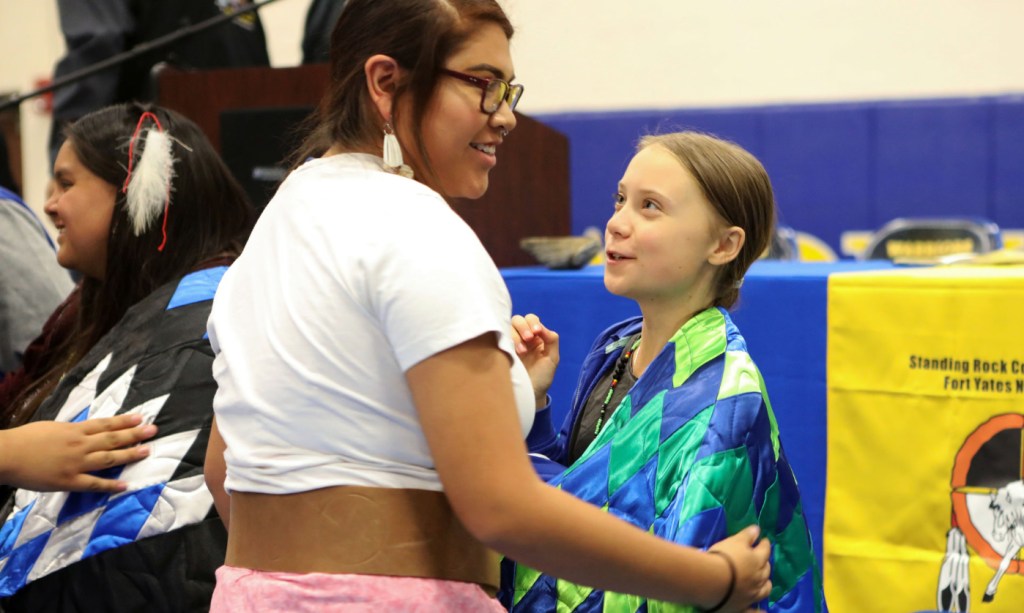 Greta Thunberg, aktivistica za zaštitu okoliša, je dobila ime Indijanaca Lakota, Maphiyata echiyatan hin win, što se prevodi kao “žena koja je došla s neba”. Prilikom dodjele priznanja zaogrnuta je u suvremeni plašt Sioux Indijanaca pun rombova: