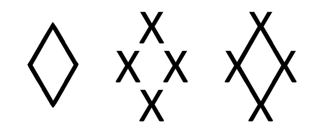 U etnološkoj ornamentici uz jednostavni romb često se pojavljuje i tzv. razrađeni romb – središnje romboidno polje iz kojeg izrastaju četiri V- ili kukasta nastavka. Takav znak, koji geometrijski odgovara polju nastalom između četiriju dijagonalnih križanja (“x” križeva), tumači se kao snažniji simbol plodnosti, središta i aktivne životne sile. Njegova forma upućuje na duboku povezanost ornamenta s tehnologijom tkanja i mreže, gdje se značenje rađa iz same strukture križanja.